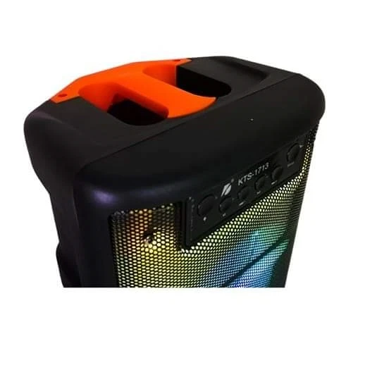 بعد از دو مدل افسانه ای kts 1592 و kts 1299 اینبار نوبت خود نمایی محصول جدید شرکت کی تی اس به نام kts 1713 هستیم.1713 همانند مدل قبلی خود دارای دو ساب 6.5 اینچی با کیفیت و یک تیوتر یک اینچی فوق العاده می باشد.شرکت کی تی اس در این سری از تولیدات خود تمرکز را بر روی کیفیت صدا گذاشته که اینبار بر روی ظاهر نیز کار شده ولی از کنترل خبری نیست. با اسپیکر قدرتمند و قابل حمل 1713 می توانید مهمانی را با صدای قدرتمند و نمایش نور پویا شروع کنید. این اسپیکر دارای دو عدد داریو فول رنج میباشد. (تیوتر و میدرنج) که تمام فرکانس های زیر و بم را پشتیبانی خواهد کرد. این دستگاه با نورپردازی منحصر به فرد فول پنل با قابلیت تغییر ، همراه با صدای قدرتمند و باس عمیق، برای هر مهمانی، محتوای جدیدی به ارمغان می آورد. مزیت این اسپیکر به این صورت است که امکان شارژ و پخش همزمان برای آن وجود دارد. شما می توانید مهمانی را تمام روز تأمین کنید. با 3 ساعت دوام باتری قابل شارژ داخلی، پخش ادامه خواهد یافت.