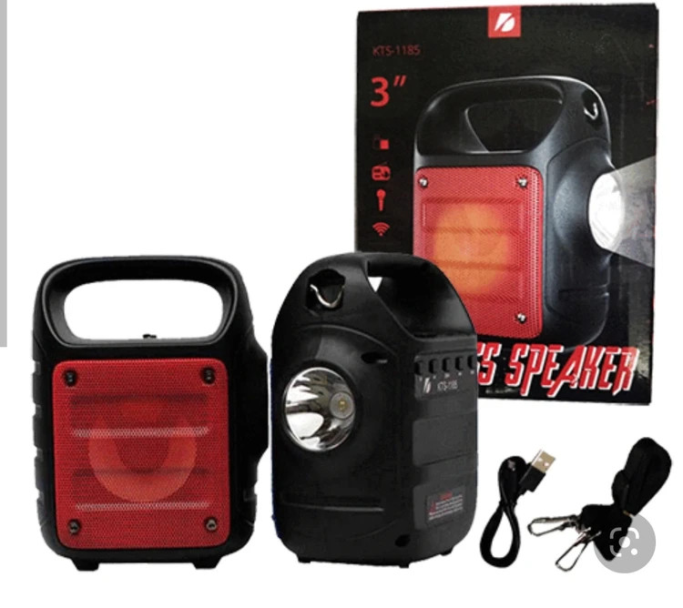 اسپیکر قابل حمل KTS-1185 مجهز به چراغ LED قوی دارای سه حالت زیاد- متوسط و چشمک زن میباشد که از این اسپیکر قابل حمل میتوان به عنوان چراغ شارژی نیز استفاده نمود ، این اسپیکر دارای باند خروجی به قطر سه اینچ و توان 5 وات با کیفیت صدای بسیار مناسب میباشد.با این اسپیکر میتوان از طريق فناوري بلوتوث به تلفنهمراه يا پخشکنندهي صوتي متصل شد. در قسمت بالایی اسپيکر يک درگاه USB و يک درگاه کارت حافظه به چشم ميخورد که از طريق آنها نيز میتوانید موسيقي دلخواهتان را گوش دهيد .این اسپیکر توانایی پشتیبانی از کارت حافظه و USB با ظرفیت 32 گیگا بایت را دارد. از ويژگي هاي ديگر اين اسپيکر ميتوان به راديو FM و ورودی میکروفون اشاره کرد. این اسپیکر دارای باطری قابل شارژ نیز میباشد. وجود نور با چندین رنگ متفاوت در قسمت جلویی اسپیکر، زیبایی خاصی را ایجاد نموده است .