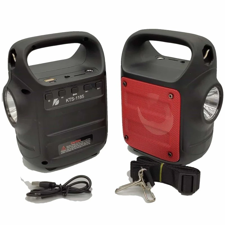 اسپیکر قابل حمل KTS-1185 مجهز به چراغ LED قوی دارای سه حالت زیاد- متوسط و چشمک زن میباشد که از این اسپیکر قابل حمل میتوان به عنوان چراغ شارژی نیز استفاده نمود ، این اسپیکر دارای باند خروجی به قطر سه اینچ و توان 5 وات با کیفیت صدای بسیار مناسب میباشد.با این اسپیکر میتوان از طريق فناوري بلوتوث به تلفنهمراه يا پخشکنندهي صوتي متصل شد. در قسمت بالایی اسپيکر يک درگاه USB و يک درگاه کارت حافظه به چشم ميخورد که از طريق آنها نيز میتوانید موسيقي دلخواهتان را گوش دهيد .این اسپیکر توانایی پشتیبانی از کارت حافظه و USB با ظرفیت 32 گیگا بایت را دارد. از ويژگي هاي ديگر اين اسپيکر ميتوان به راديو FM و ورودی میکروفون اشاره کرد. این اسپیکر دارای باطری قابل شارژ نیز میباشد. وجود نور با چندین رنگ متفاوت در قسمت جلویی اسپیکر، زیبایی خاصی را ایجاد نموده است .