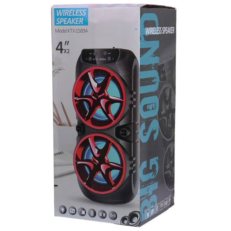 اسپیکر بلتوثی قابل حمل حاوی دو عدد اسپیکر 4 اینچی 5 وات است که با تغذیه باتری 1800 میلی آمپری تا 2 ساعت با 75 درصد ولوم قابلیت پخش مداوم را دارد.این اسپیکر دارای درگاه فلش تا 32 گیگابایت و مموری کارت تا 32 گیگابایت می باشد .این اسپیکر دارای قابلیت اتصال همزمان دو اسپیکر به هم یا همان TWS نیز هست.در بخش ظاهری اسپیکر بلوتوثی قابل حمل مدل KTX-1589A شاهد یک طراحی عام پسند هستیم. در طراحی این محصول سعی شده تا با استفاده از المانهای روز مانند نورپردازی، به جذابیت بصری این محصول کمک شود. در نمای روبهرو تلاش بر این بوده تا با یک پنل شبیه رینگ خوردرو، نه تنها صدای درایور به خوبی منتقل شود بلکه از مهمترین بخش یک اسپیکر یعنی درایور محافظت شود. معمولا در اسپیکرهای قابل حمل، صدمه و ضربات احتمالی میتواند محصول خریداری شده شما را خراب کند، اما ساختاری که بتواند محافظت خوبی را ارائه کند، قطعاً قابل ستایش است. استفاده از حجمهای بسیار، نورپردازی RGB و بیرونزدگی پنل درایورهای اسپیکر، به جذابیت بصری محصول افزوده است. پنل براق کلیدهای مدیریتی در این نما دیده میشود و نام محصول هم در میان این پنل جا خوش کرده است. البته این پنل پتانسیل خوبی برای نشان دادن لک و چربی دارد پس بهتر است در نگهداری آن کوشا باشید. با کمی حرکت به سمت بالا، پنل درگاههای ارتباطی قابل مشاهده است. پشت اسپیکر هم با حفرهای در بالا و پایین، قابلیت جابهجایی را آسان ساخته است.دو درایور 3 اینچ، این اسپیکر را همراهی میکند. صدای تولیدی از این درایور برای این سطح از بودجه مناسب ارزیابی میشود. این اسپیکر با توجه به ساختاری که در بخش درایور دارد، قابلیتهای خوبی در بخش خروجی فرکانسهای مختلف دارد. توان واقعی یا RMS هر دو درایور برابر با 10 وات است و پرتاب صدای بسیار خوبی از این مدل شاهد هستیم. همچنین محدوده پاسخگویی فرکانس بین 100 تا 20 هزار هرتز است. نسبت سیگنال به نویز هم 85 دسیبل عنوان شده که برای این سگمنت قابل قبول است. اسپیکر بلوتوثی قابل حمل مدل KTX-1589A با باتری داخلی 1200 میلیآمپرساعتی، شما را حتی در مسافرت، دورهمی دوستانه و مهمانی تنها نمیگذارد.