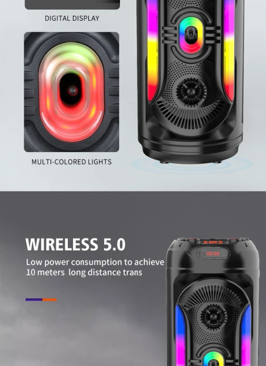 اسپیکر Zqs مدل 8260 یکی از بهترین گزینهها برای علاقهمندان به موسیقی و صداهای باکیفیت است. این اسپیکر با طراحی مدرن و امکانات پیشرفتهای که ارائه میدهد، توانسته جایگاه ویژهای در میان کاربران پیدا کند.این اسپیکر با یک میکروفون بیسیم ارائه میشود که به کاربران این امکان را میدهد تا به راحتی از قابلیتهای صوتی و کارائوکه استفاده کنند.همراه این دستگاه یک کابل شارژ نیز ارائه میشود که فرآیند شارژ دستگاه را آسان میکند. وجود ریموت کنترل به کاربران اجازه میدهد تا از فاصله دور نیز تنظیمات موردنظر خود را بر روی اسپیکر اعمال کنند.این اسپیکر دارای دو ساب ووفر 8 اینچی است که صدایی عمیق و با کیفیت را تولید میکند. این ویژگی باعث میشود تا کاربران تجربهای لذتبخش از شنیدن موسیقی داشته باشند.اسپیکر ZQS دارای یک باتری با ظرفیت 5000 میلیآمپر ساعت است. این ظرفیت بالا امکان استفاده طولانی مدت از اسپیکر را بدون نیاز به شارژ مکرر فراهم میکند.اسپیکر مجهز به چراغهای LED است که قابلیت تغییر رقص نور را دارند و میتوانند هماهنگ با ریتم موسیقی، جلوهای زیبا و جذاب ایجاد کنند.این اسپیکر امکاناتی مانند تنظیم بیس، تریبل و اکو را در اختیار کاربران قرار میدهد. این ویژگیها به شما اجازه میدهند تا صدا را به دلخواه خود شخصیسازی کنید.وجود رادیو FM به کاربران این امکان را میدهد تا از شنیدن برنامههای رادیویی نیز لذت ببرند. این اسپیکر میتواند فضایی به وسعت 100 تا 150 متر را پوشش دهد که برای مهمانیها، دورهمیها و حتی فضاهای باز نیز بسیار مناسب است