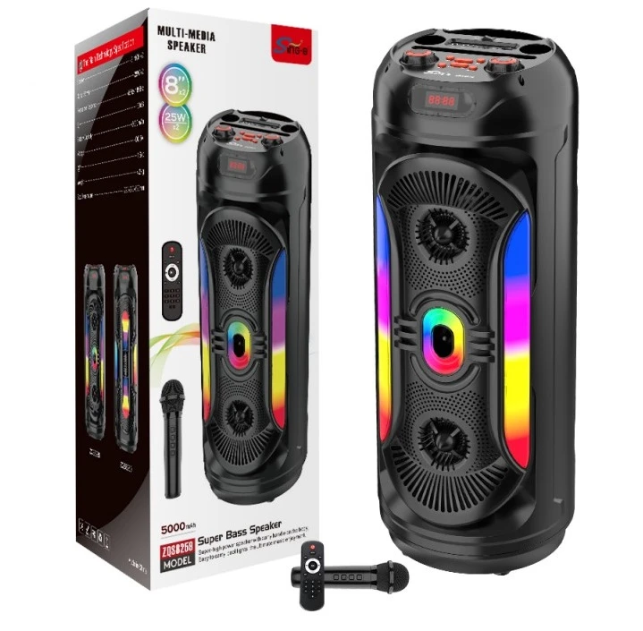 اسپیکر Zqs مدل 8260 یکی از بهترین گزینهها برای علاقهمندان به موسیقی و صداهای باکیفیت است. این اسپیکر با طراحی مدرن و امکانات پیشرفتهای که ارائه میدهد، توانسته جایگاه ویژهای در میان کاربران پیدا کند.این اسپیکر با یک میکروفون بیسیم ارائه میشود که به کاربران این امکان را میدهد تا به راحتی از قابلیتهای صوتی و کارائوکه استفاده کنند.همراه این دستگاه یک کابل شارژ نیز ارائه میشود که فرآیند شارژ دستگاه را آسان میکند. وجود ریموت کنترل به کاربران اجازه میدهد تا از فاصله دور نیز تنظیمات موردنظر خود را بر روی اسپیکر اعمال کنند.این اسپیکر دارای دو ساب ووفر 8 اینچی است که صدایی عمیق و با کیفیت را تولید میکند. این ویژگی باعث میشود تا کاربران تجربهای لذتبخش از شنیدن موسیقی داشته باشند.اسپیکر ZQS دارای یک باتری با ظرفیت 5000 میلیآمپر ساعت است. این ظرفیت بالا امکان استفاده طولانی مدت از اسپیکر را بدون نیاز به شارژ مکرر فراهم میکند.اسپیکر مجهز به چراغهای LED است که قابلیت تغییر رقص نور را دارند و میتوانند هماهنگ با ریتم موسیقی، جلوهای زیبا و جذاب ایجاد کنند.این اسپیکر امکاناتی مانند تنظیم بیس، تریبل و اکو را در اختیار کاربران قرار میدهد. این ویژگیها به شما اجازه میدهند تا صدا را به دلخواه خود شخصیسازی کنید.وجود رادیو FM به کاربران این امکان را میدهد تا از شنیدن برنامههای رادیویی نیز لذت ببرند. این اسپیکر میتواند فضایی به وسعت 100 تا 150 متر را پوشش دهد که برای مهمانیها، دورهمیها و حتی فضاهای باز نیز بسیار مناسب است