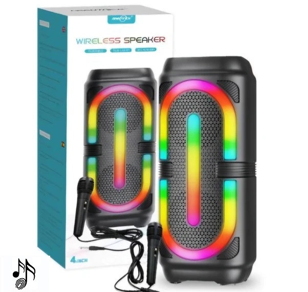 جنس بدنه ساخته شده از پلاستیک با کیفیت، مقاوم در برابر آسیب های احتمالی همچون فشار و ضربه دارای یک عدد درگاه USB و یک عدد درگاه TF جهت پخش فایل های ذخیره شده ویک عدد درگاه اتصال میکروفون کلیدهای فیزیکی تعبیه شده بر روی بدنه جهت مدیریت موسیقی، MODE، خاموش/ روشن و...، اقلام همراه یک عدد میکروفون اتصال بی سیم از طریق بلوتوث و اتصال با سیم توسط جک 3.5 میلی متری صدا، مجهز به نورپردازی RGB جهت ایجاد جلوه بصری زیبا تامین انرژی از طریق باتری لیتیومی با ظرفیت 1500mAh، شارژ مجدد از طریق درگاه تایپ سی تعبیه شده بر روی بدنه توسط کابل همراه برخوردار از 2 درایو 4 اینچی با توان خروجی 10 وات (2*5W)، حساسیت سیگنال به نویز 80db و پاسخ فرکانسی 100 هرتز الی 20 کیلوهرتز