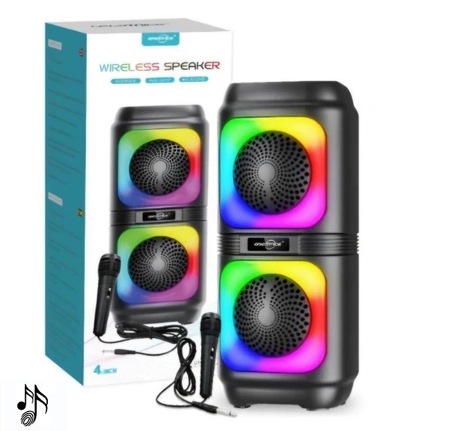 جنس بدنه ساخته شده از پلاستیک با کیفیت، مقاوم در برابر آسیب های احتمالی همچون فشار و ضربه دارای یک عدد درگاه USB و یک عدد درگاه TF جهت پخش فایل های ذخیره شده ویک عدد درگاه اتصال میکروفون کلیدهای فیزیکی تعبیه شده بر روی بدنه جهت مدیریت موسیقی، MODE، خاموش/ روشن و...، اقلام همراه یک عدد میکروفون اتصال بی سیم از طریق بلوتوث و اتصال با سیم توسط جک 3.5 میلی متری صدا، مجهز به نورپردازی RGB جهت ایجاد جلوه بصری زیبا تامین انرژی از طریق باتری لیتیومی با ظرفیت 1500mAh، شارژ مجدد از طریق درگاه تایپ سی تعبیه شده بر روی بدنه توسط کابل همراه برخوردار از 2 درایو 4 اینچی با توان خروجی 10 وات (2*5W)، حساسیت سیگنال به نویز 80db و پاسخ فرکانسی 100 هرتز الی 20 کیلوهرتز