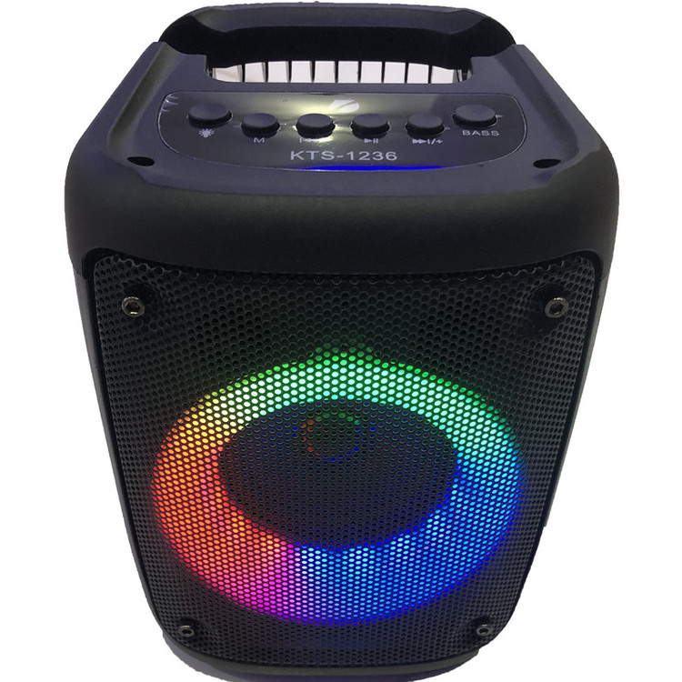 اسپیکر بلوتوثی ۱۲۳۶ یکی از محصولات شرکت KTS می باشد که با توجه به ابعاد و وزن نسبتا مناسب خود می تواند در هر جایی لذت گوش دادن به موسیقی را برای کاربران فراهم کند. قسمت جلویی اسپیکر بلوتوثی KTS میزبان درایو آن به همراه نورپردازی RGB می باشد تا این اسپیکر بتواند صدا را به صورت مستقیم و با بیشترین کیفیت به گوش کاربران برساند و جلوه های بصری بسیار زیبایی به آن ها نیز ارائه کند. درایو اسپیکر KTS1236 توسط یک توری فلزی نیز مورد محافظت قرار گرفته تا نگرانی برای کاربران جهت آسیب دیدن آن در استفاده های طولانی مدت وجود نداشته باشد. پورت های اتصال با سیم KTS1236 در قسمت پشتی آن قرار دارند و به هیچ عنوان زیبایی قسمت جلویی این محصول را دچار اختلال نمی کنند. کلید های کنترل موسیقی و صدا هم در قسمت بالایی اسپیکر بلوتوثی KTS1236 قرار دارند و دسترسی به آن ها کار دشواری به نظر نمی رسد.
