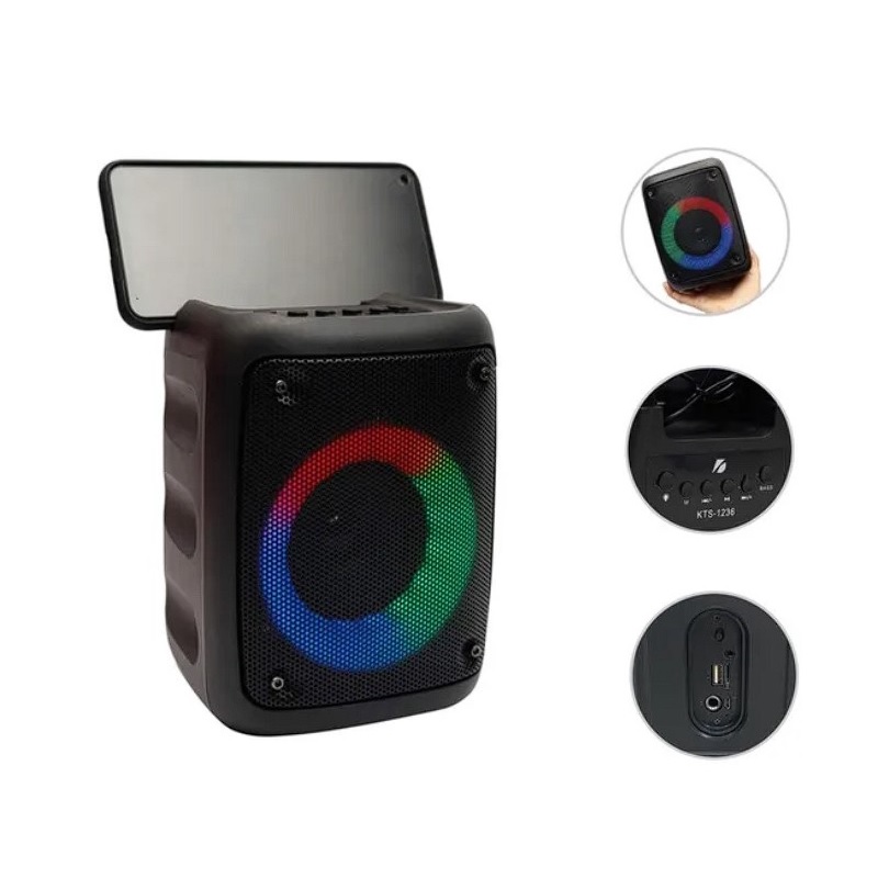 اسپیکر بلوتوثی ۱۲۳۶ یکی از محصولات شرکت KTS می باشد که با توجه به ابعاد و وزن نسبتا مناسب خود می تواند در هر جایی لذت گوش دادن به موسیقی را برای کاربران فراهم کند. قسمت جلویی اسپیکر بلوتوثی KTS میزبان درایو آن به همراه نورپردازی RGB می باشد تا این اسپیکر بتواند صدا را به صورت مستقیم و با بیشترین کیفیت به گوش کاربران برساند و جلوه های بصری بسیار زیبایی به آن ها نیز ارائه کند. درایو اسپیکر KTS1236 توسط یک توری فلزی نیز مورد محافظت قرار گرفته تا نگرانی برای کاربران جهت آسیب دیدن آن در استفاده های طولانی مدت وجود نداشته باشد. پورت های اتصال با سیم KTS1236 در قسمت پشتی آن قرار دارند و به هیچ عنوان زیبایی قسمت جلویی این محصول را دچار اختلال نمی کنند. کلید های کنترل موسیقی و صدا هم در قسمت بالایی اسپیکر بلوتوثی KTS1236 قرار دارند و دسترسی به آن ها کار دشواری به نظر نمی رسد.